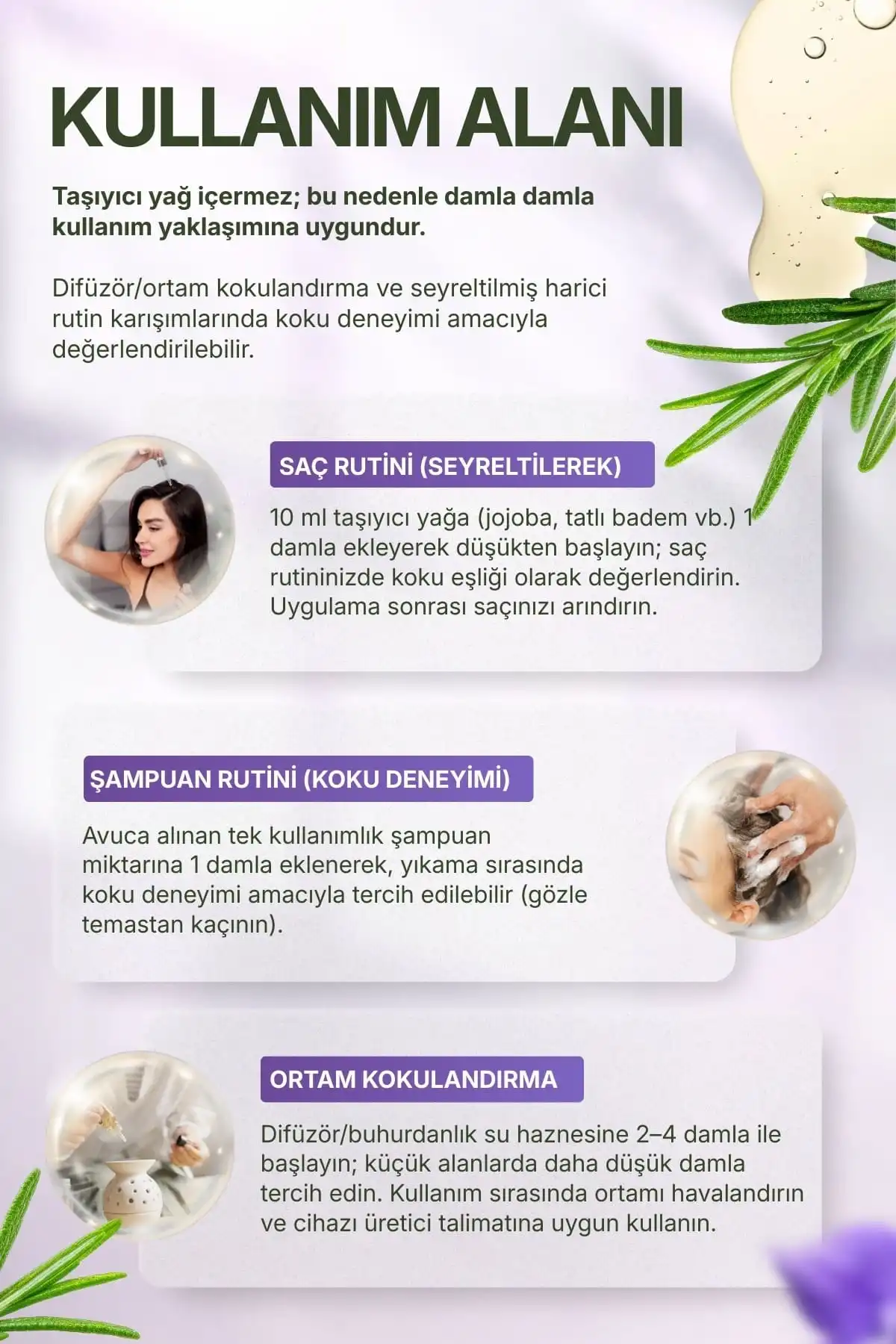 Saç bakım ürünlerine (şampuan, saç kremi vb.) birkaç damla eklenerek bakım rutinine dahil edilebilir.