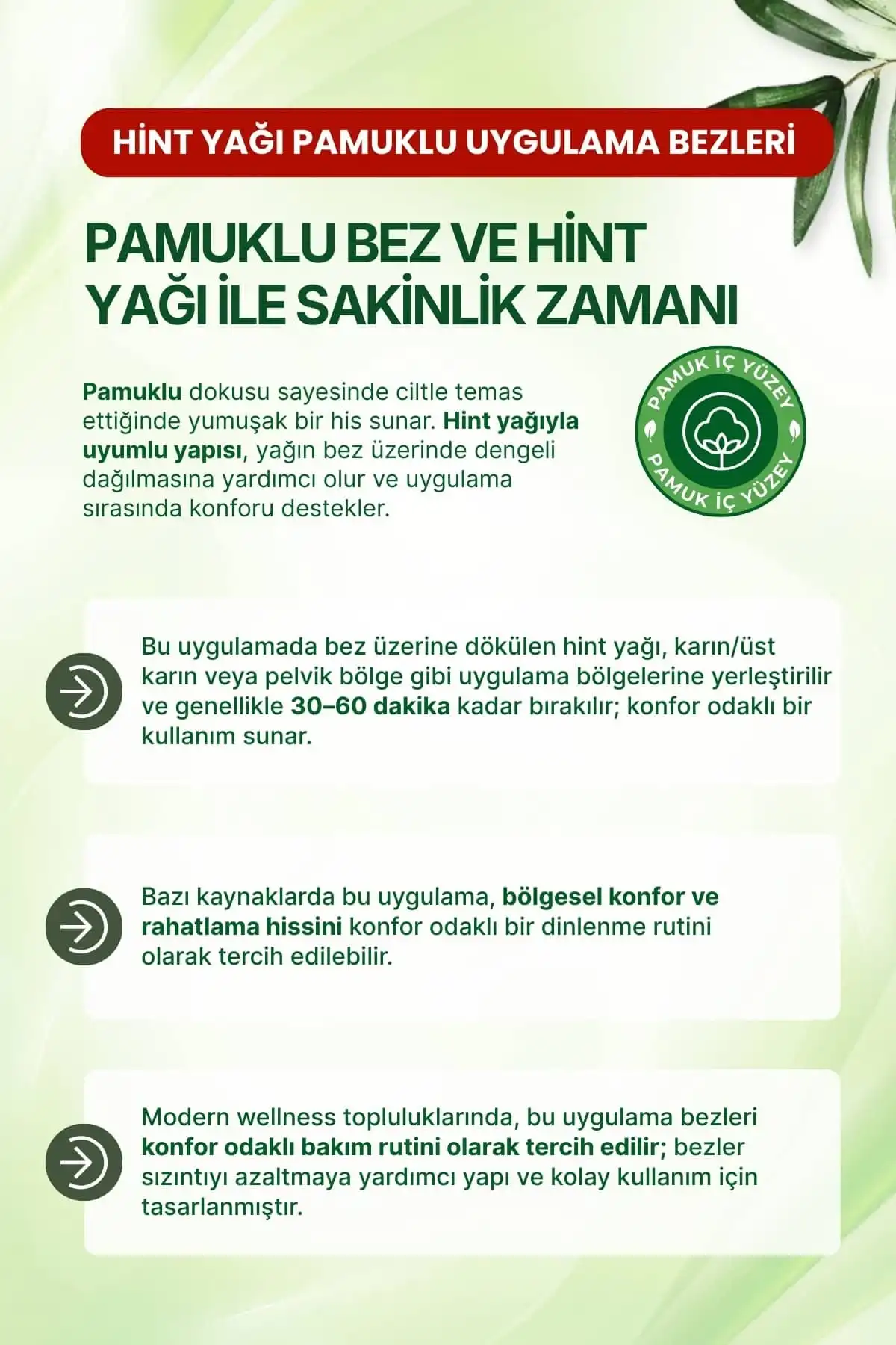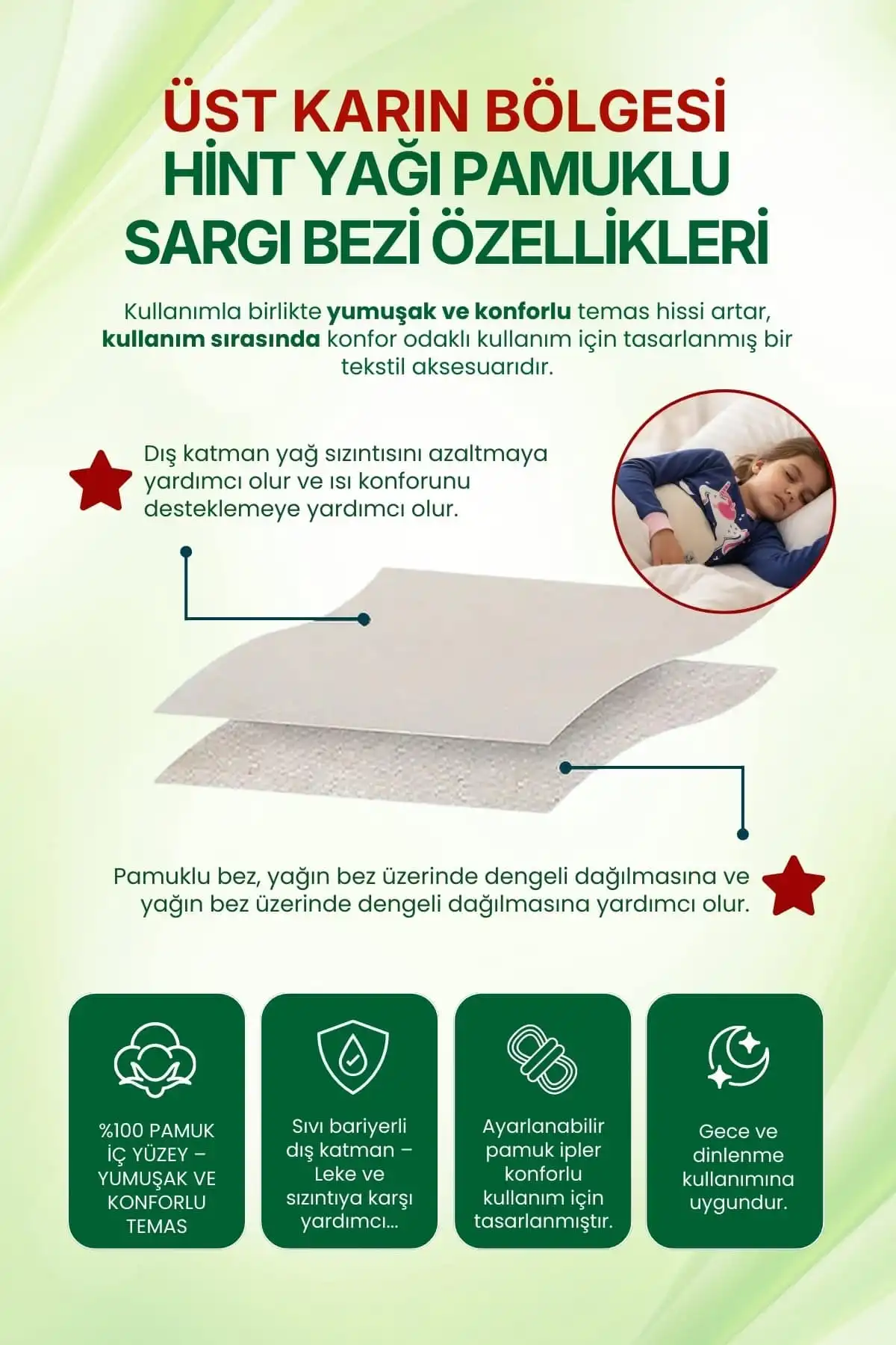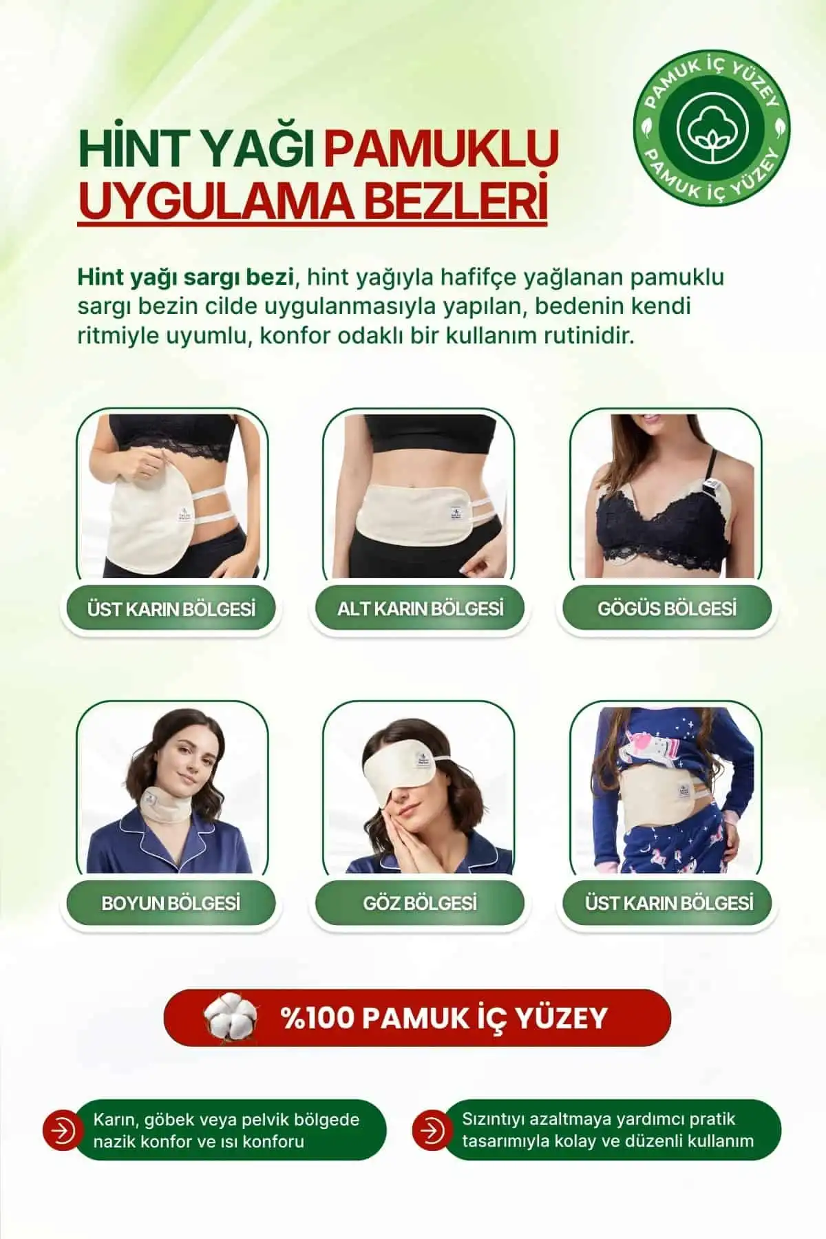 Geleneksel hint yağı (castor oil) uygulama rutinlerini çocuklar için daha nazik, temiz ve pratik hale getirmek amacıyla üretilmiştir. Çocukların hassas cildine temas eden iç yüzey yumuşak ham pamuktan, dış yüzey ise sıvı geçirmez koruyucu katmandan oluşur. Sağ kaburga altı ve üst karın bölgesinin kıvrımlarına uyum sağlayan kavisli formu ve çocuk bedenine göre küçültülmüş ölçüleri sayesinde, ebeveyn gözetiminde konforlu bir kullanım hedeflenir.