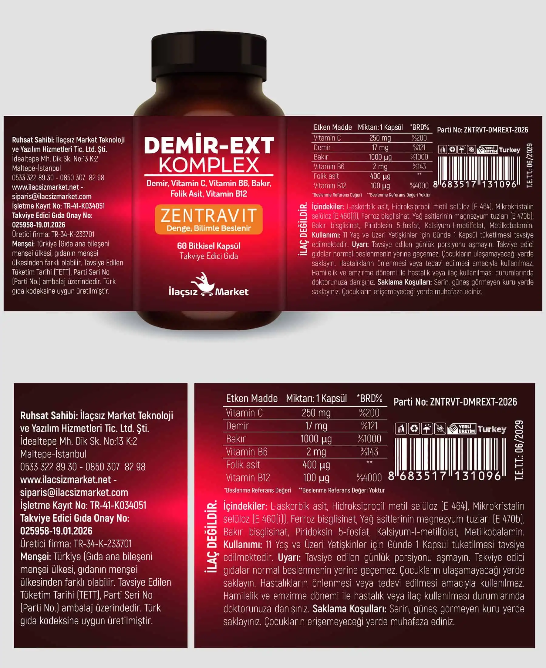 Ürün; FDA kayıtlı (15830586508), GMP, ISO 22000, ISO 9001 ve HELAL sertifikalı tesiste üretilmiştir. Avrupa menşeli içerikler kullanılmaktadır.