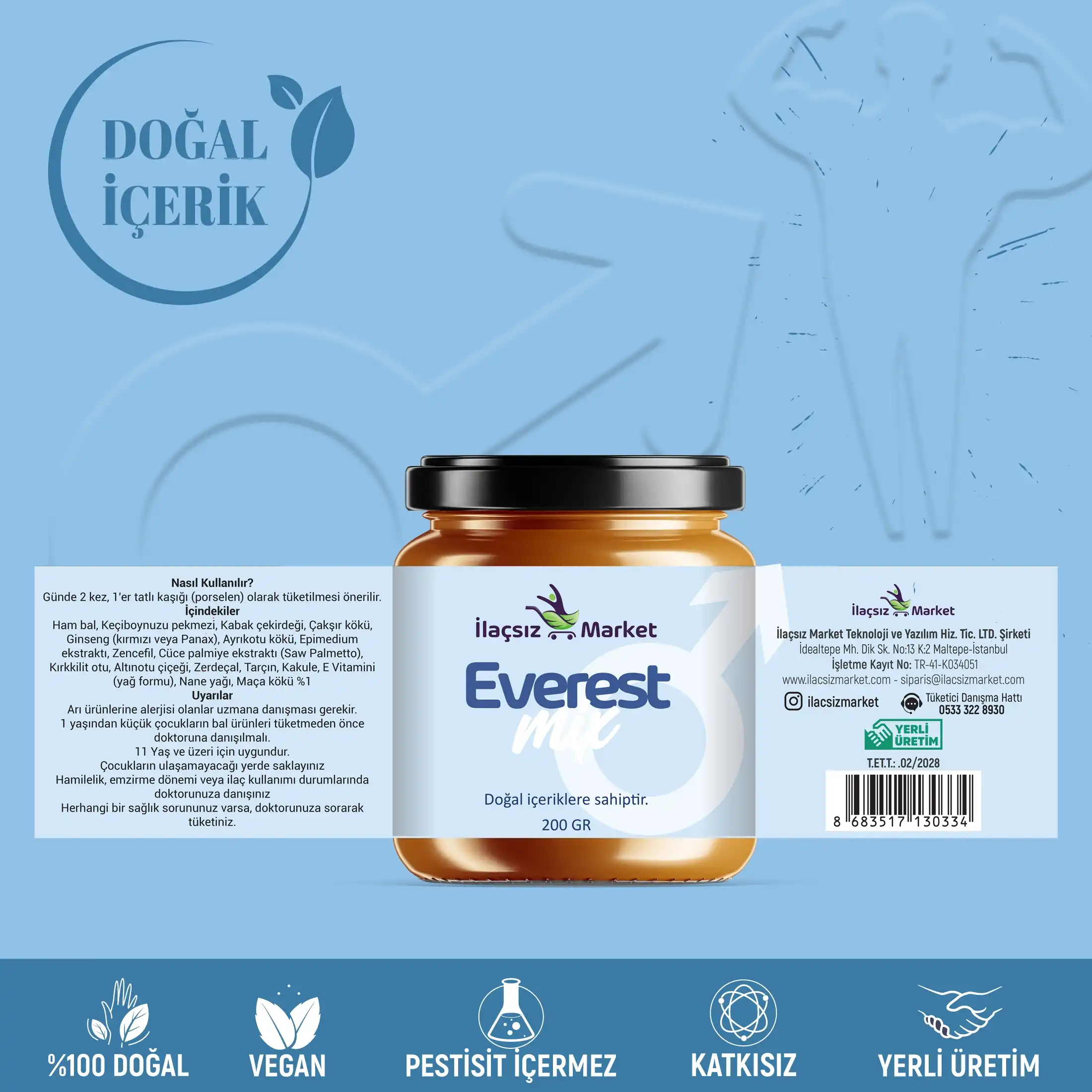 Everest Mix Macun Erkeklere Özel Güçlü Formül: Doğanın Köklerinden Gelen Destek Günümüzün yoğun temposunda, aktif bir yaşam tarzını benimseyen ve beslenmesine özen gösteren erkekler için özel olarak geliştirilen İlaçsız Market Everest Mix, geleneksel bitkisel bilgeliği modern bir formülle sunar. Bu zengin karışım; Ham Bal ve Keçiboynuzu Pekmezi gibi doğal enerji kaynaklarını; Ginseng (Panax), Epimedium, Çakşır Kökü ve Cüce Palmiye (Saw Palmetto) gibi erkeklere yönelik gıda takviyelerinde sıkça tercih edilen güçlü bitki ekstreleriyle birleştirir. Koruyucu ve renklendirici içermeyen yapısıyla, günlük rutininize doğal ve güçlü bir dokunuş katar. Neden Everest Mix?
