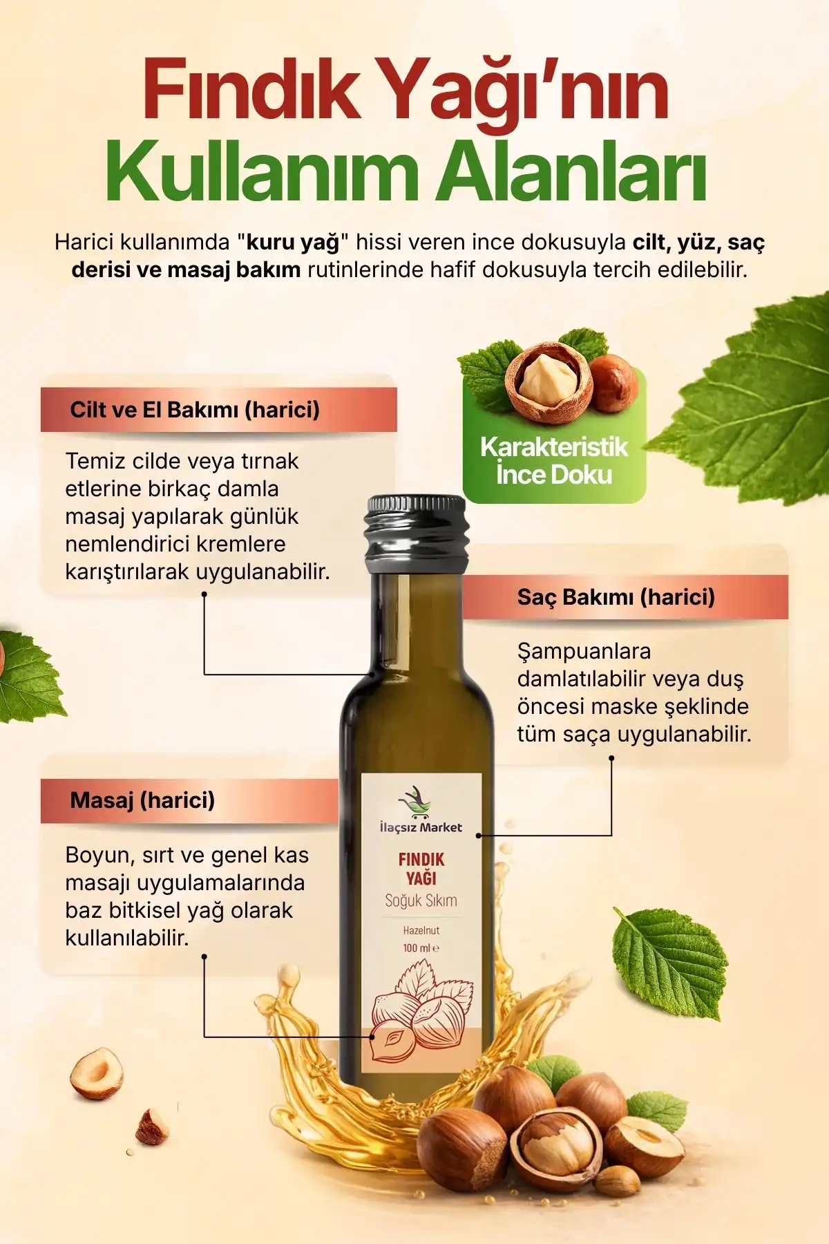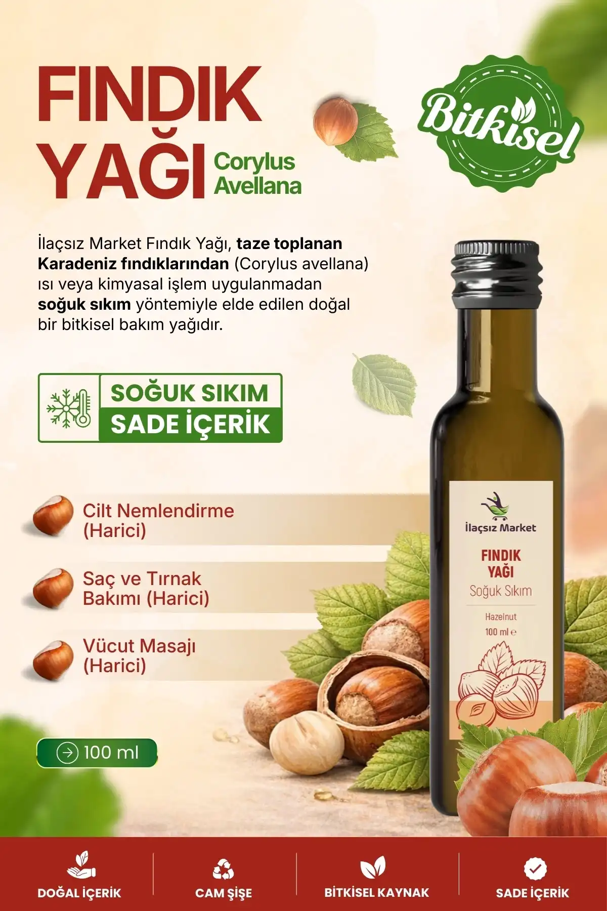 Fındık yağı, Corylus avellana meyvelerinden hiçbir ısıl işlem görmeden soğuk sıkım tekniğiyle elde edilen, cildin alt katmanlarına hızla nüfuz eden çok değerli bir sabit yağdır. İlaçsız Market kalitesiyle sunulan bu yağ, doğal E vitamini ve temel yağ asitleri bakımından zengindir, koruyucu veya katkı maddesi içermez.
