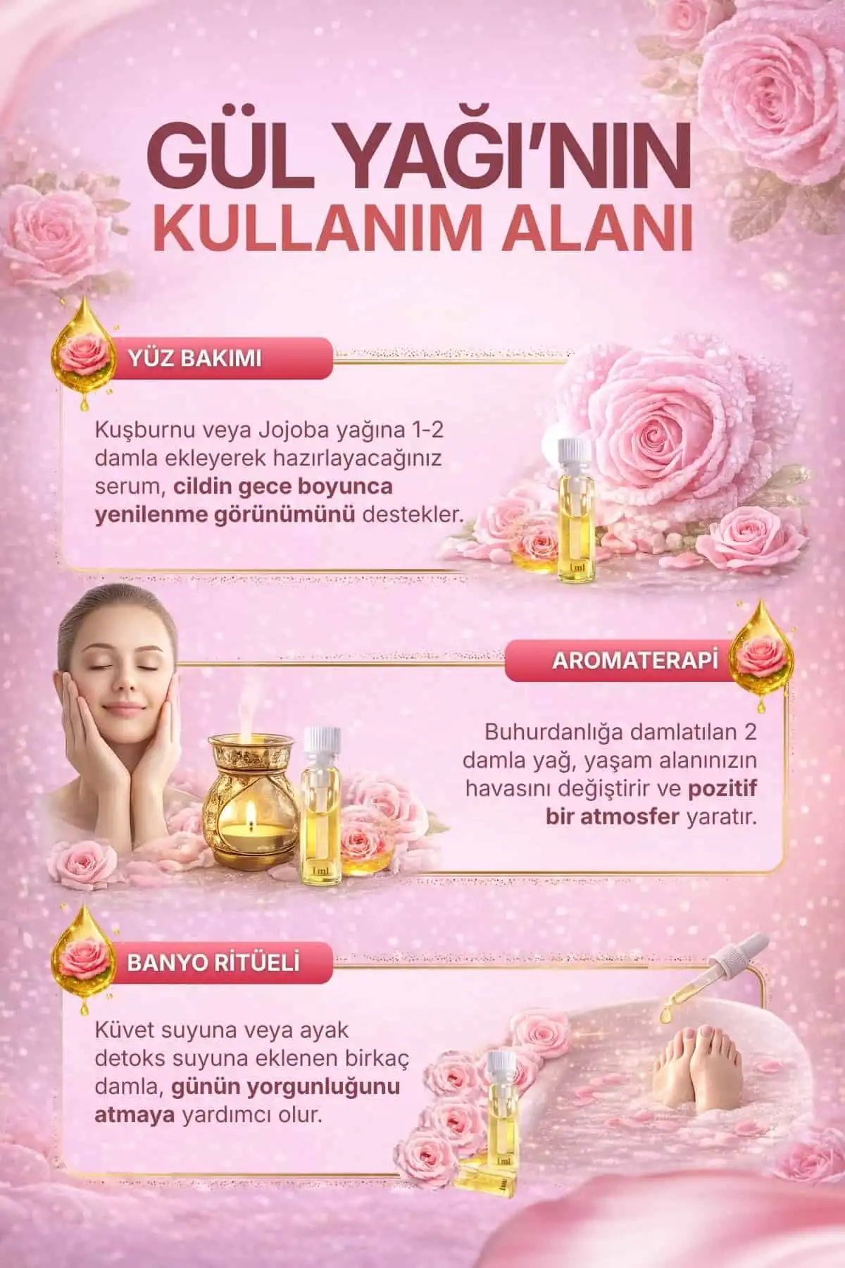 Gül yağı çok güçlü ve konsantre bir uçucu yağdır. Cilde doğrudan saf halde uygulanması önerilmez, mutlaka bir "Taşıyıcı Yağ" ile seyreltilmelidir. İşte güvenli ve etkili kullanım tarifleri: