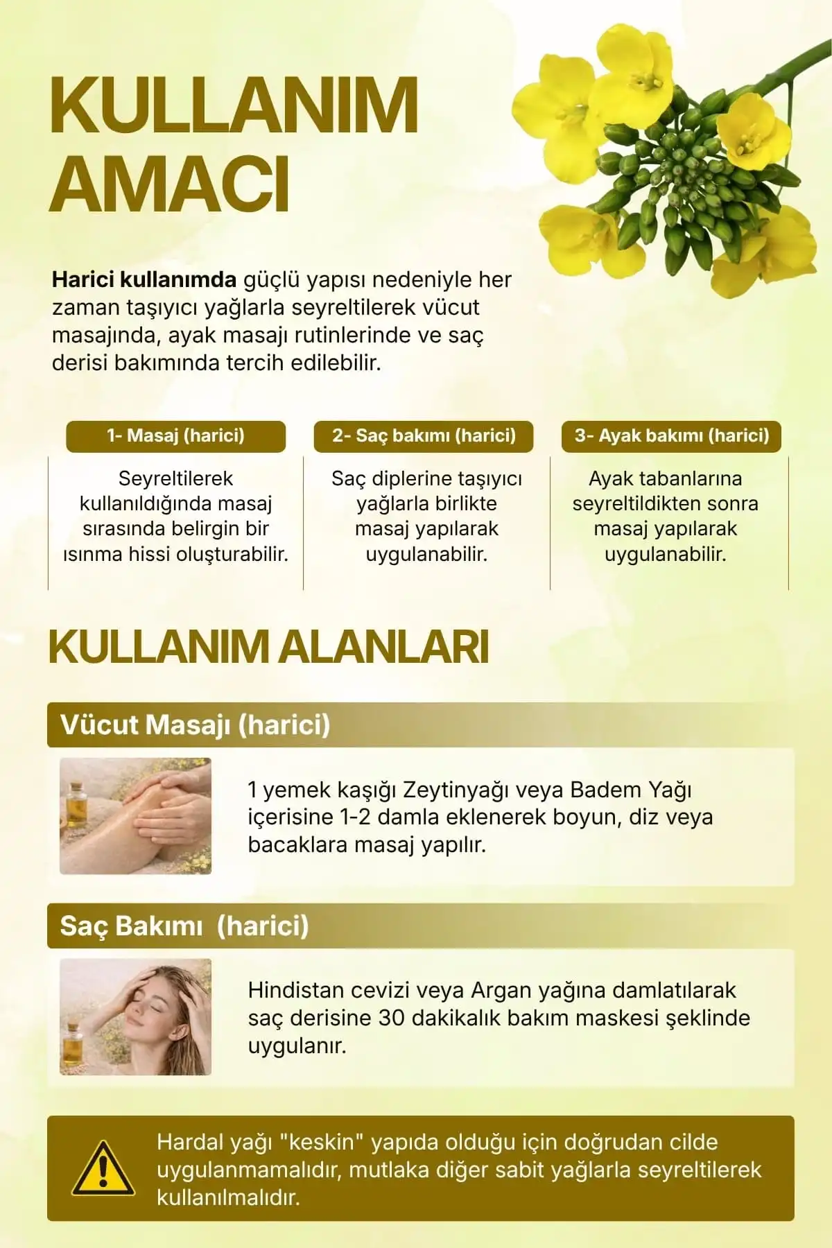 Hardal yağı doğal bir ısıtıcıdır. Uygulanan bölgede hafif bir ısınma hissi normaldir; ancak çok hassas ciltlerde tahriş riskine karşı mutlaka küçük bir alanda test edilmelidir.