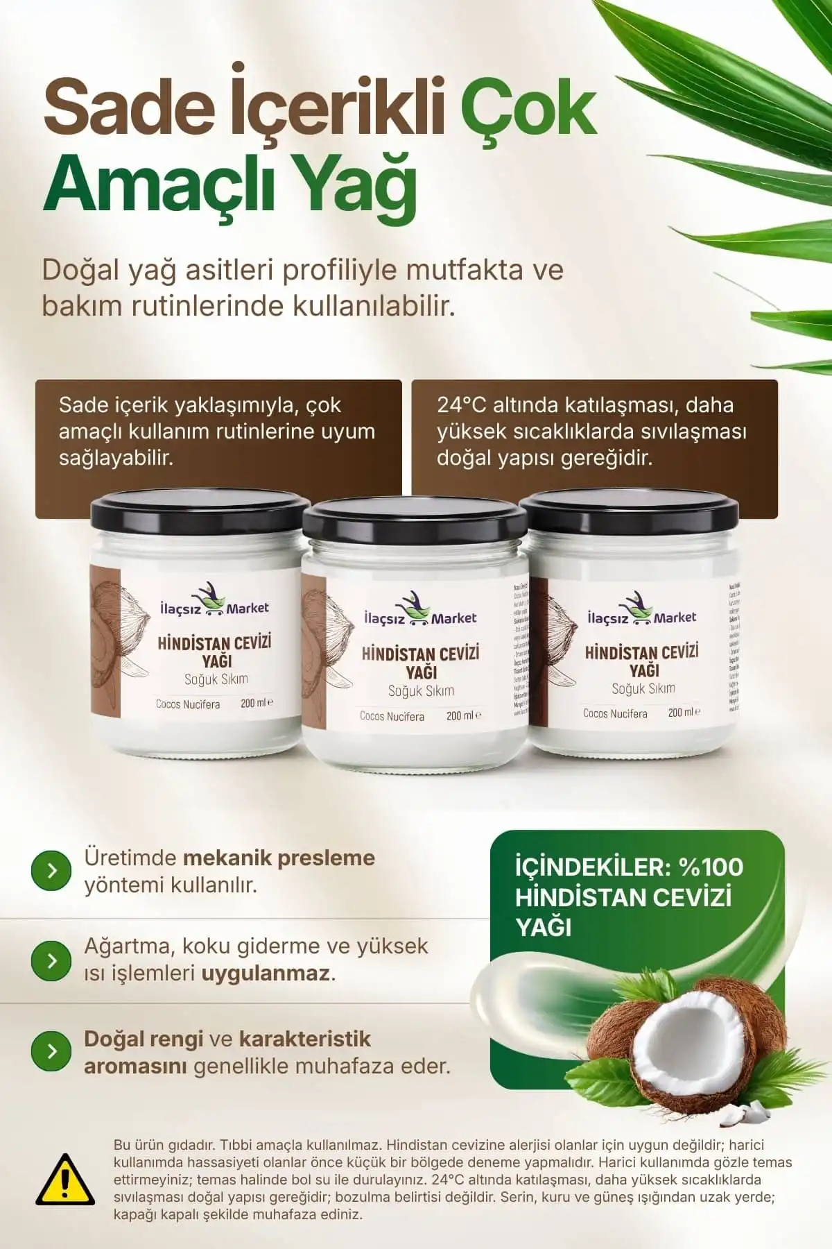 Hindistan cevizi yağı, tek kavanozla farklı rutinlere uyum sağlayabilen pratik bir üründür. Kullanım miktarını az tutup ihtiyaca göre artırmak daha konforlu olur.