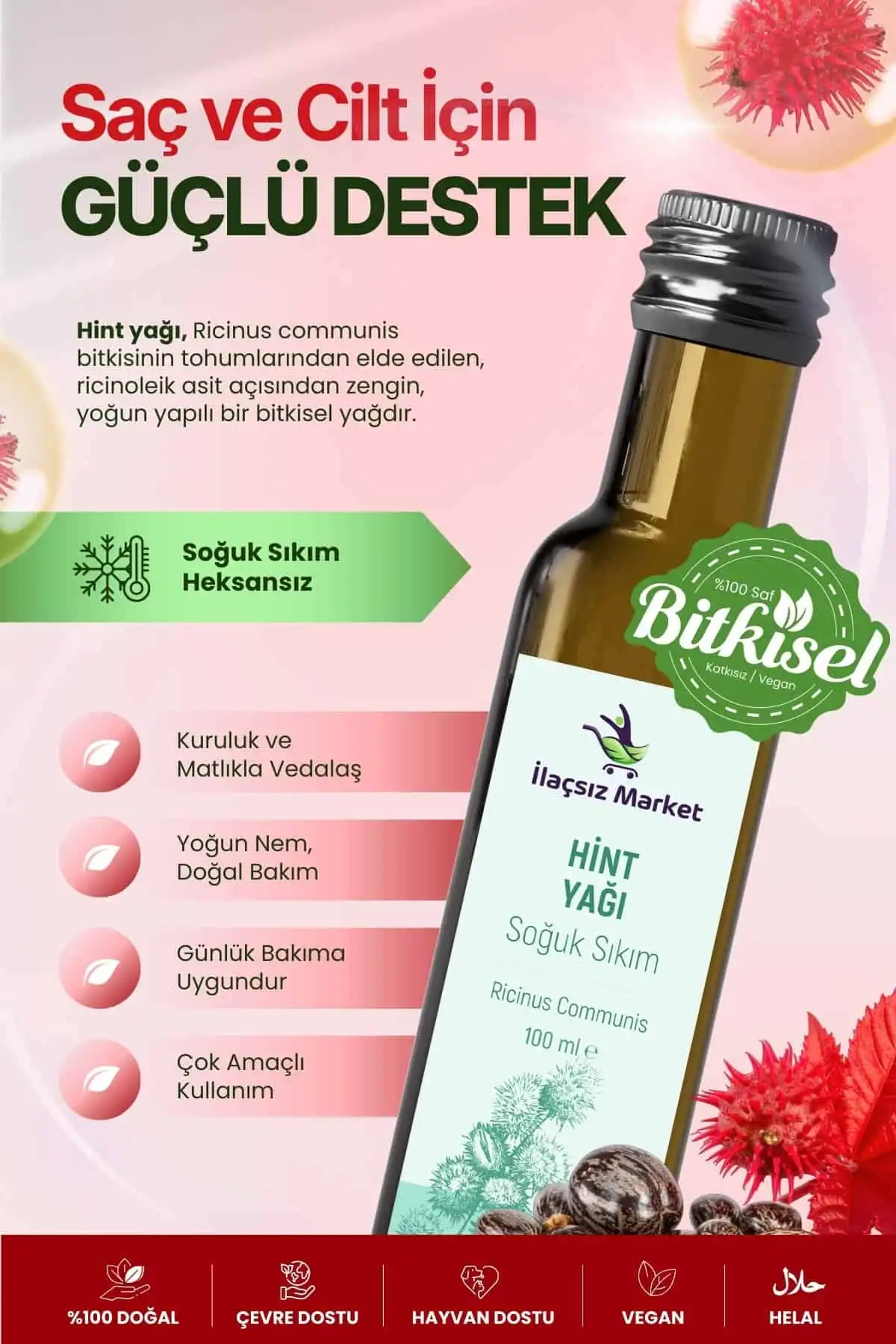 İçindekiler: %100 Ricinus Communis Seed Oil (Soğuk Sıkım Hint Yağı).