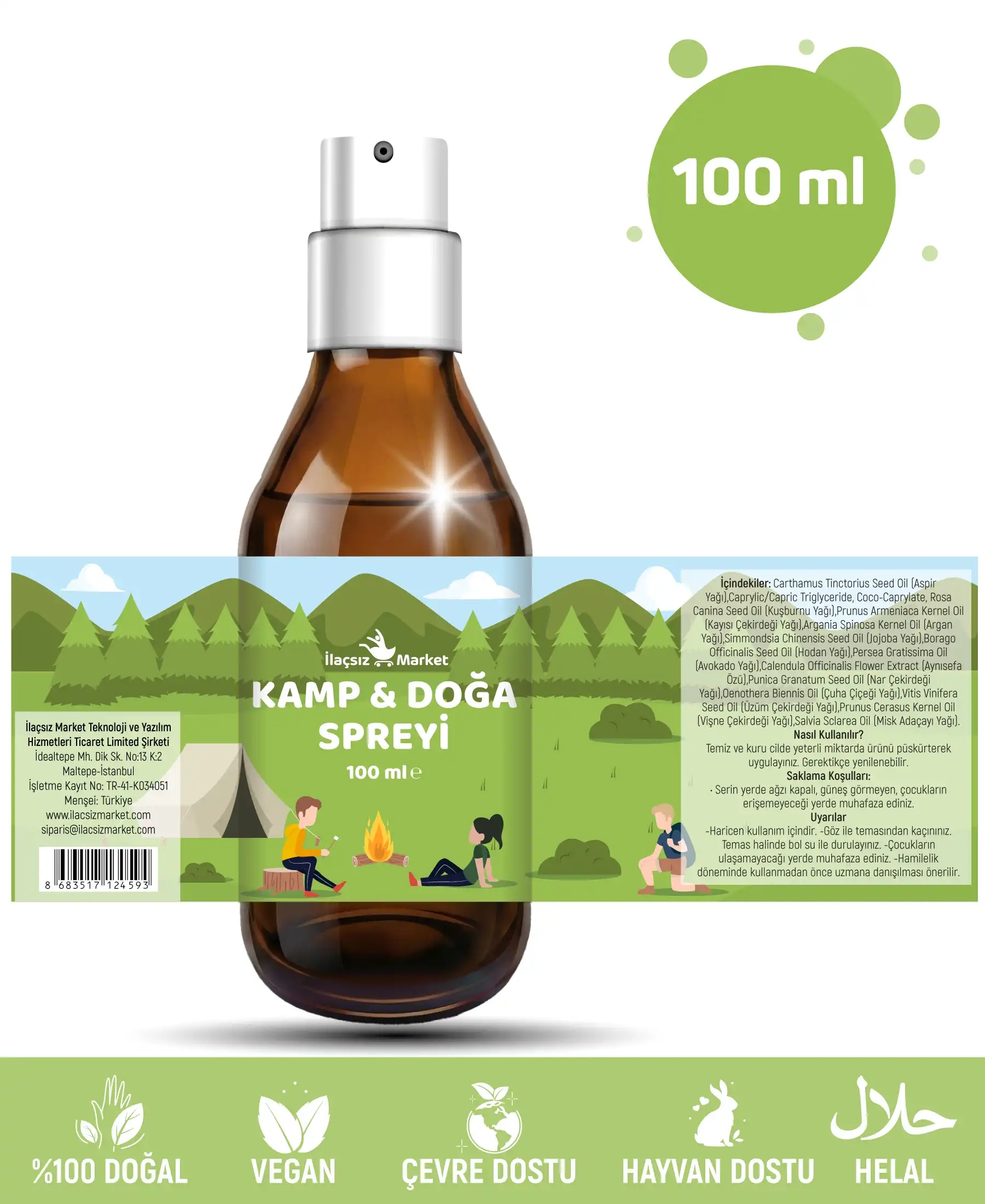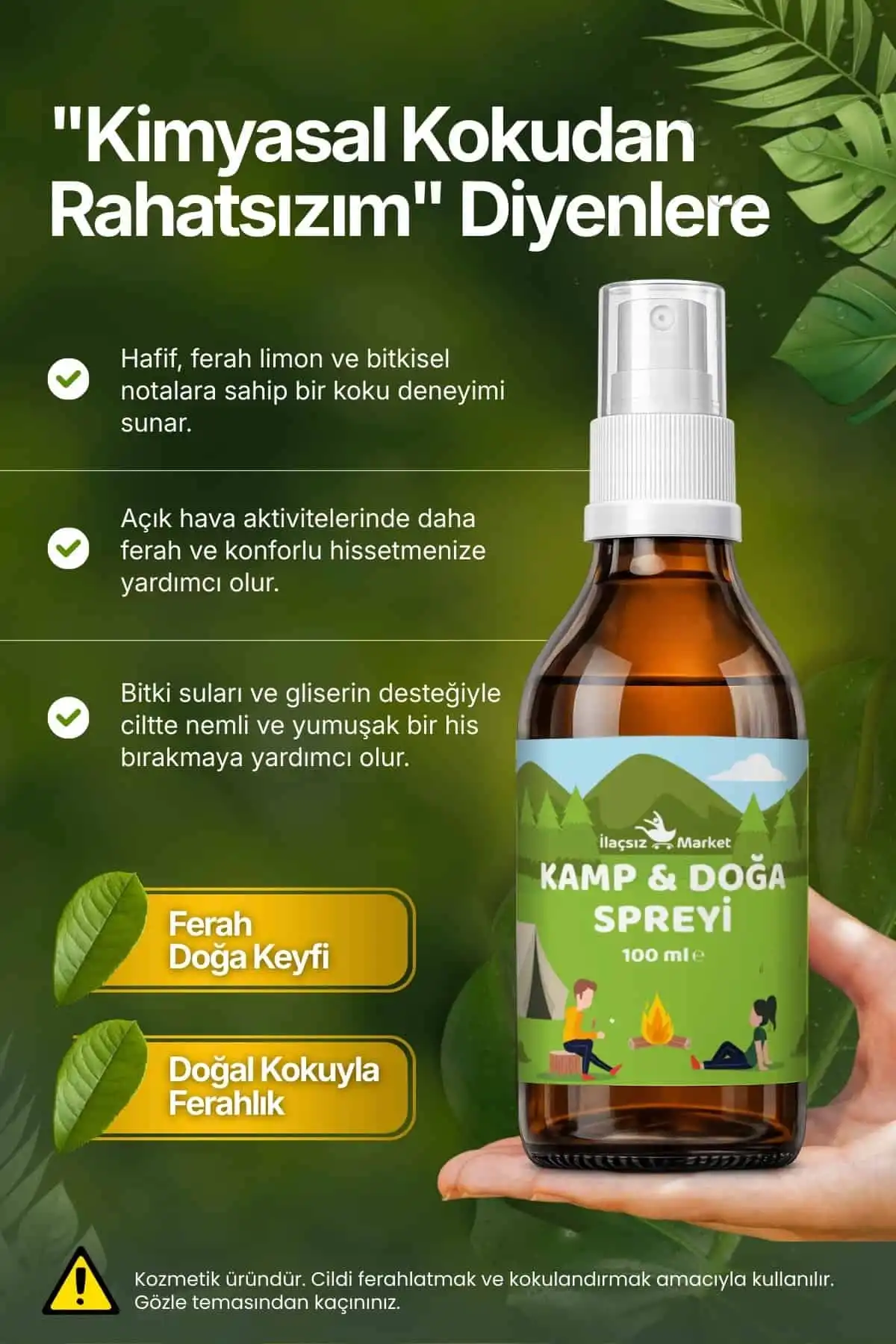 İlaçsız Market Kamp & Doğa Spreyi, açık havada geçirdiğiniz zamanın kalitesini artırmak için geliştirilmiş, su yerine %100 saf Bitki Suları (Hidrolat) kullanılarak üretilen özel bir vücut spreyidir. Formülün %90'ını oluşturan Itır (Geranium) ve Biberiye suları; cildi serinletip ferahlatırken, içeriğindeki Citronella (Limon Otu), Okaliptüs ve Limon Kabuğu uçucu yağları sayesinde tende aromatik ve taze bir koku katmanı oluşturur. Hoş kokusuyla ferahlık hissini desteklemeye yardımcı olur.