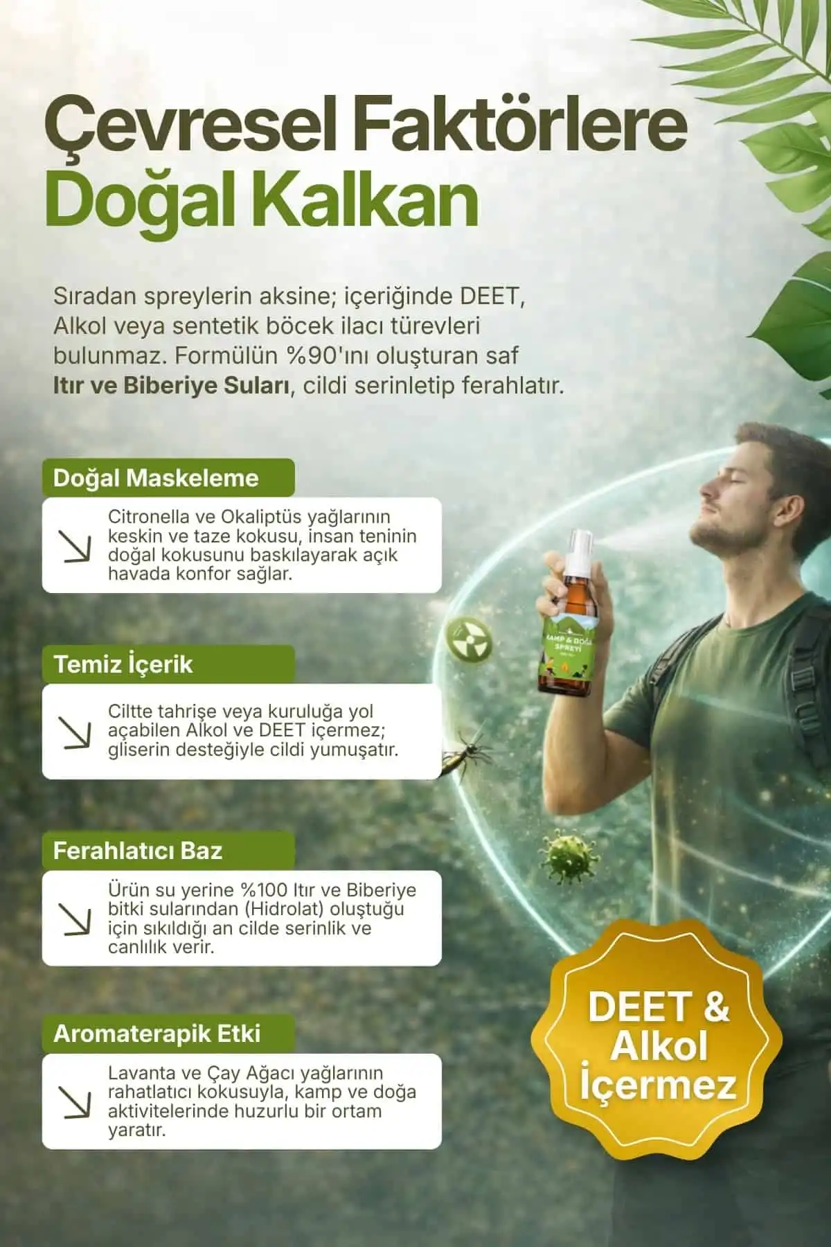 DEET ve Alkol İçermez: Cildi kurutan alkol veya sentetik kimyasal (biyosidal ürün türevi) maddeler içermez.