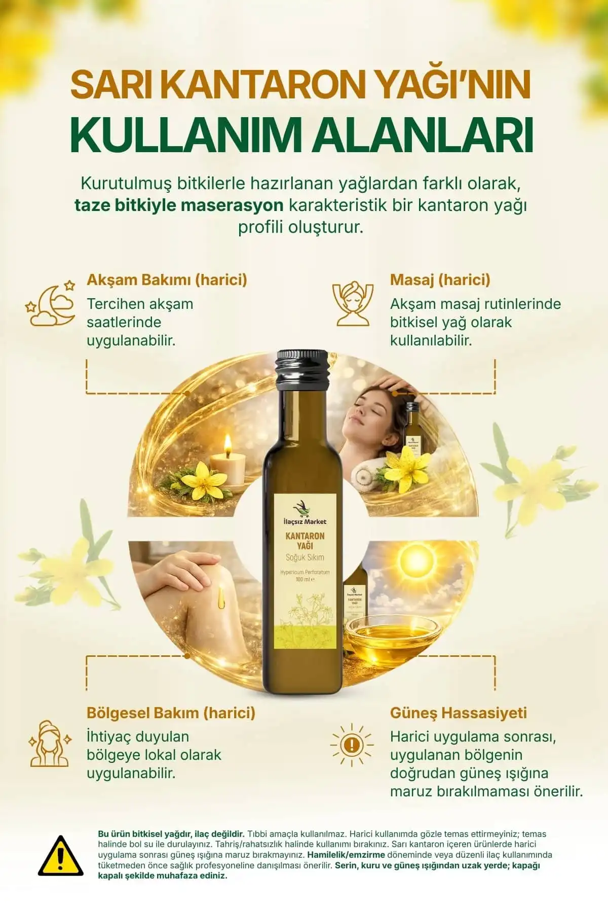 Uygulama: Akşam temizlediğiniz cildinize 3-4 damla Kantaron Yağı'nı masaj yaparak uygulayın.