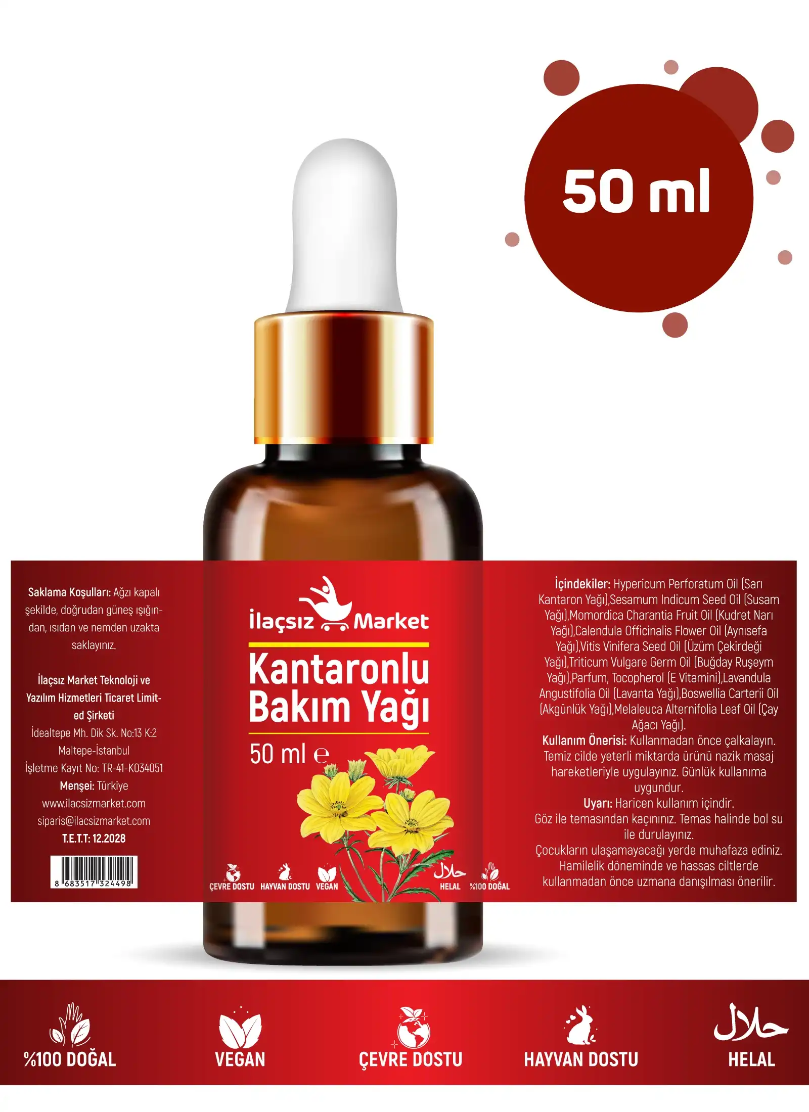 İlaçsız Market Doğal Yoğun Bakım Yağı, Anadolu topraklarının yüzyıllardır cilt bakımında kullanılan Sarı Kantaron (St. John’s Wort) ve Kudret Narı (Bitter Melon) yağlarını yüksek oranlarda bir araya getiren geleneksel bir bakım yağıdır. Sıradan bir nemlendiriciden öte; cildin dış etkenlerle yıprandığı, hassaslaştığı veya aşırı kuruyup gerildiği dönemlerde yoğun bakım desteği olarak tasarlanmıştır. Rengini boyadan değil, içindeki bitki özlerinden alan bu kırmızı yağ; formülündeki Aynısefa (Calendula),Akgünlük (Boswellia) ve Susam Yağı ile cildi beslemeye yardımcı olurken, ciltte konforlu ve koruyucu bir bakım hissi bırakır.