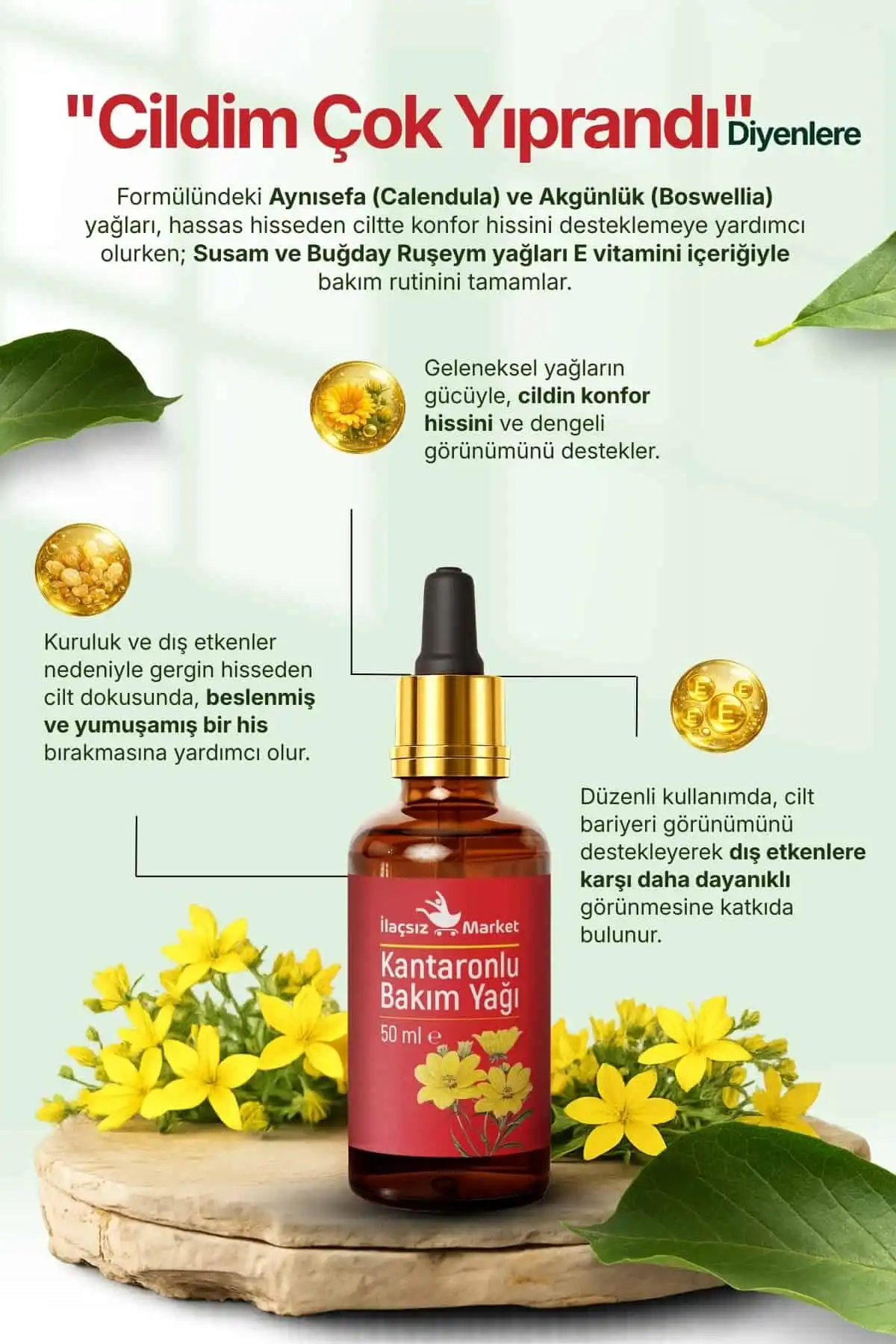 4'lü Bitkisel Uyum: Sarı Kantaron, Kudret Narı, Aynısefa ve Akgünlük yağlarının birleşimi, cilt görünümüne yönelik bakım rutinlerinde dengeli bir uyum sağlar.