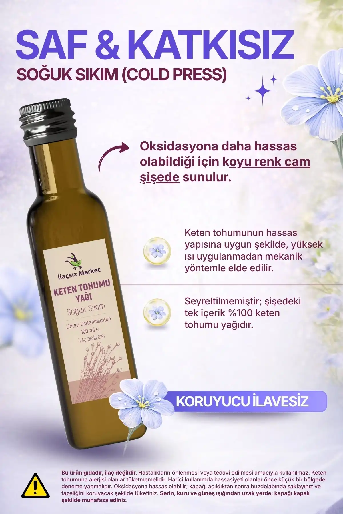 İçerik: %100 Keten Tohumu Yağı (Linum usitatissimum Seed Oil)