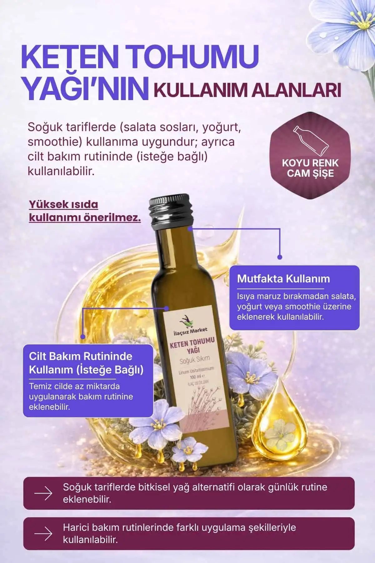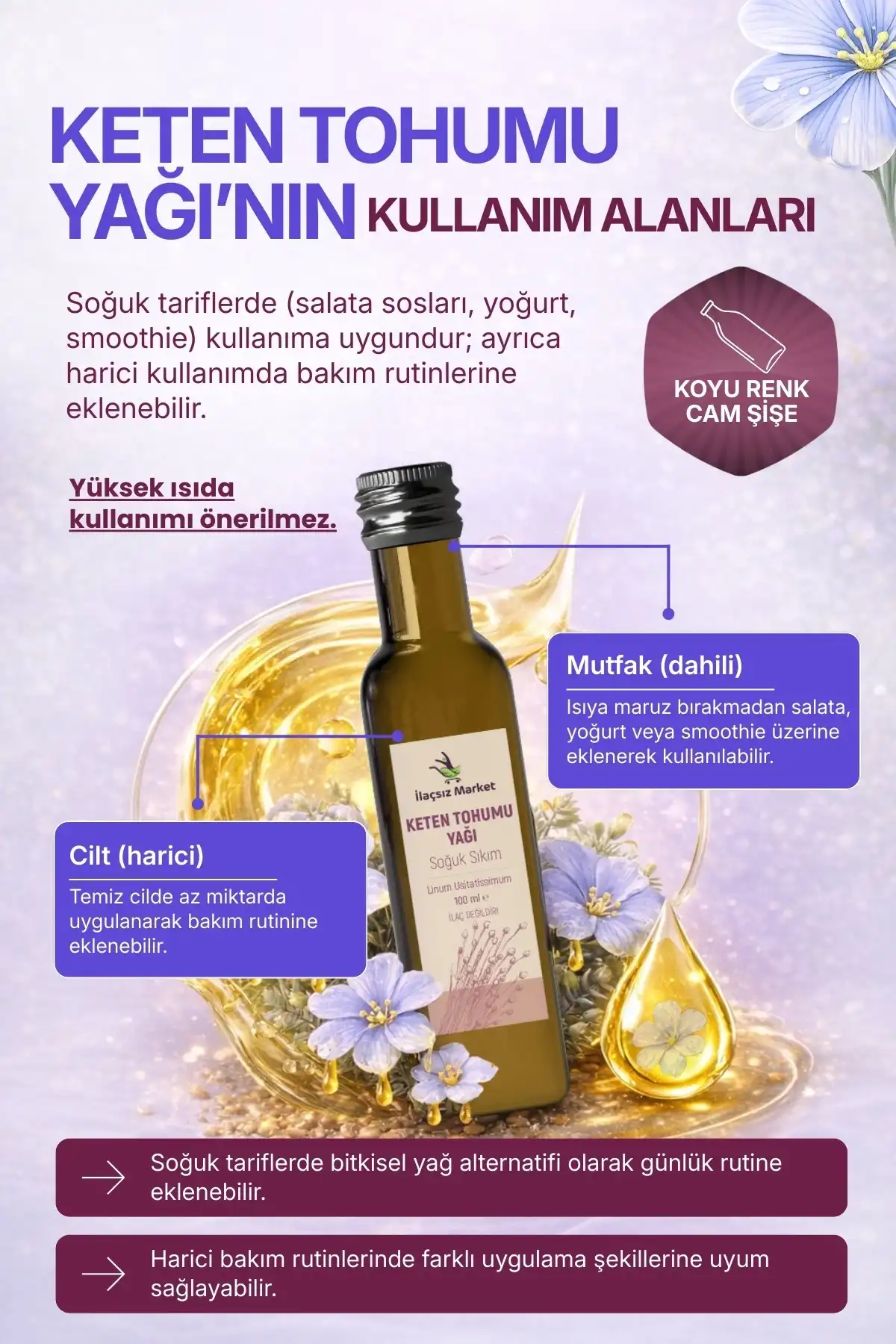 Keten tohumu yağı çok yönlü bir üründür; ancak en iyi performansı soğuk tüketim ve harici bakım rutinlerinde verir.