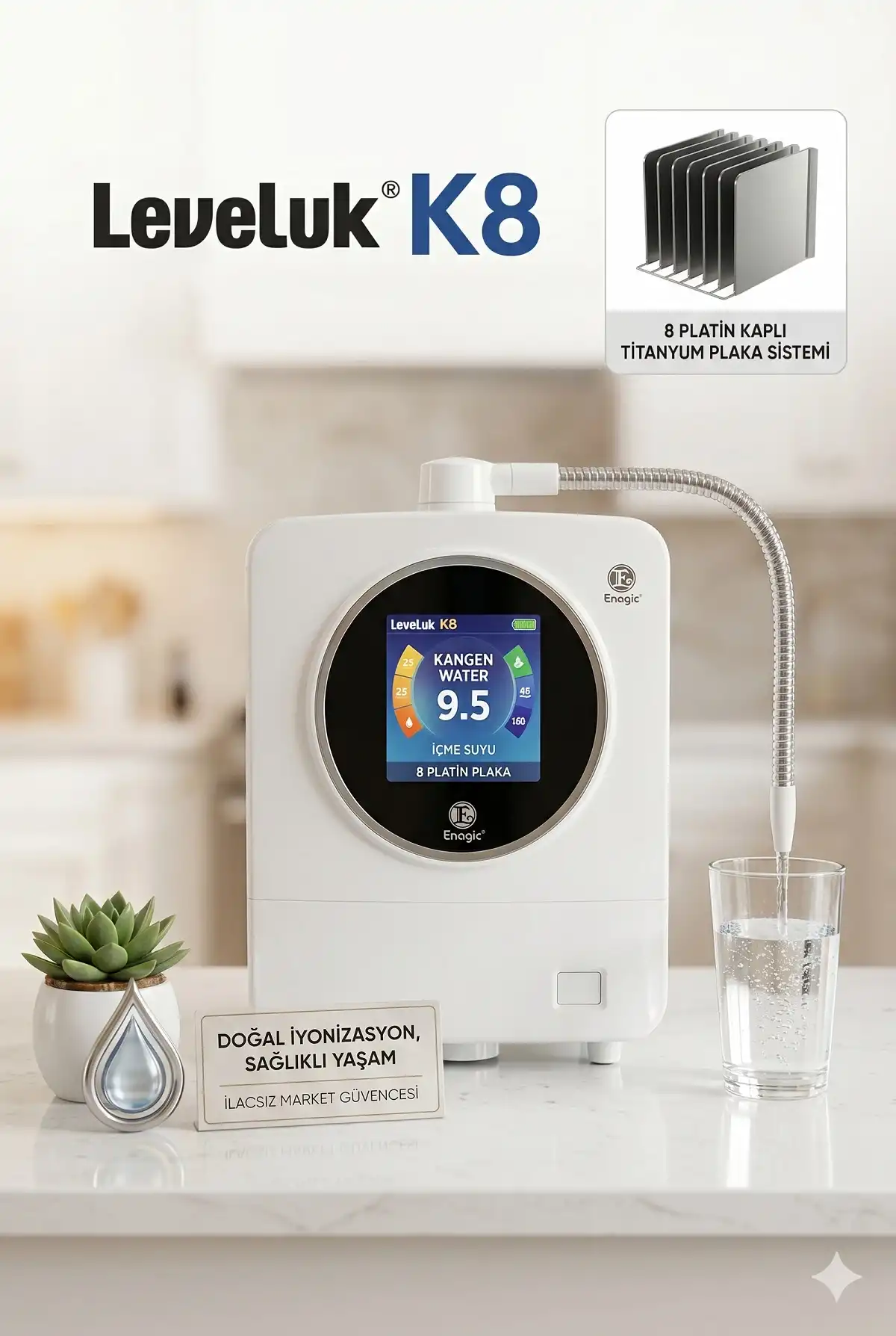 Leveluk K8, su teknolojileri alanında uzmanlaşmış Enagic firmasının en güçlü ve modern iyonizer modelidir. Mevcut şebeke suyunu önce yüksek standartlarda filtreleyip, ardından elektroliz (iyonizasyon) yöntemiyle farklı kullanım amaçlarına uygun pH seviyelerine ayıran gelişmiş bir mutfak cihazıdır.