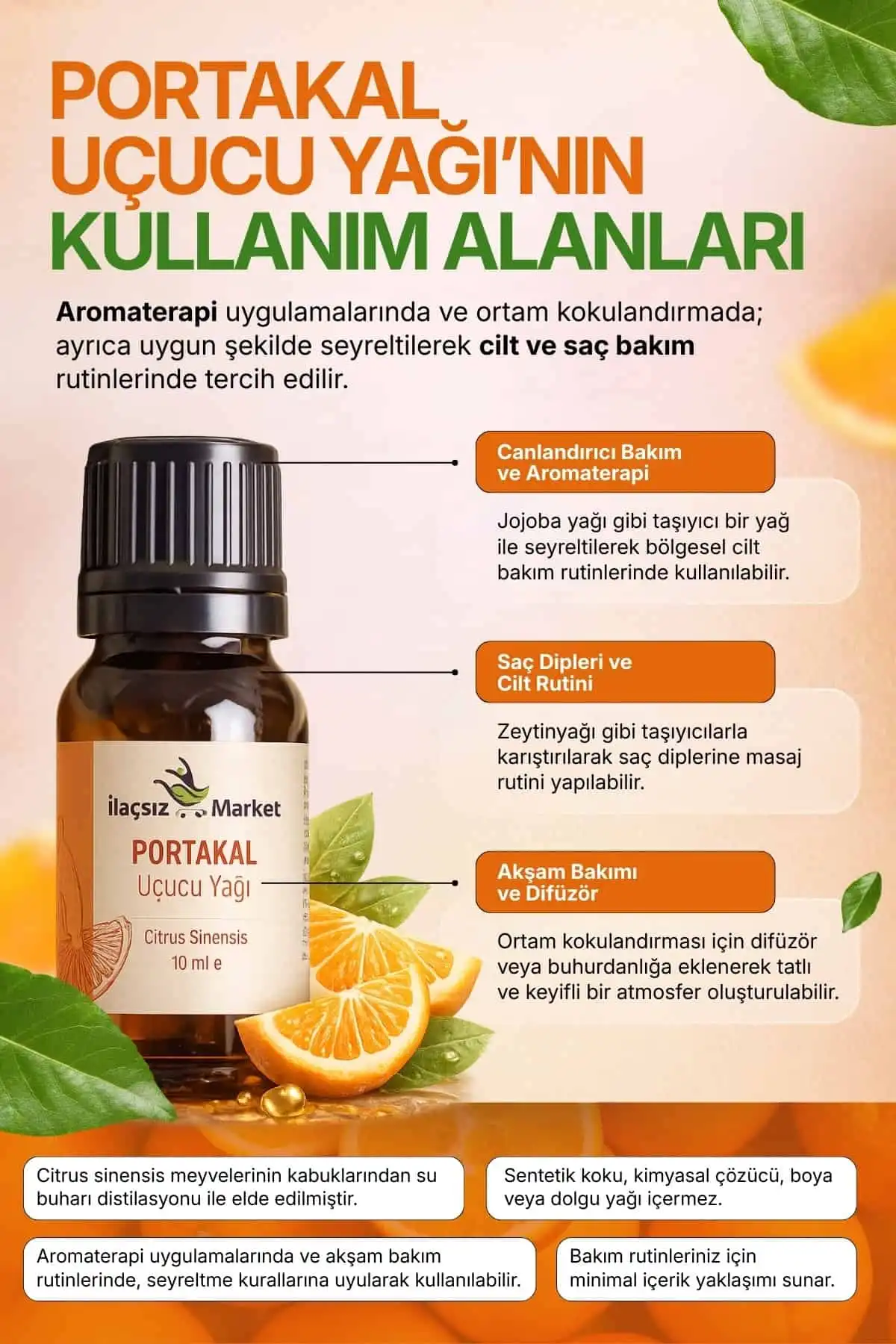 Citrus Sinensis bitkisinin kabuklarından su buharı distilasyonu yöntemiyle elde edilen %100 saf ve doğal uçucu yağdır. Canlandırıcı, ferahlatıcı ve tatlı narenciye kokusu ile aromaterapi uygulamalarında sıklıkla tercih edilir. Üretim sürecinde herhangi bir kimyasal işlem, koruyucu veya sentetik katkı maddesi kullanılmaz. Öne Çıkan Özellikler